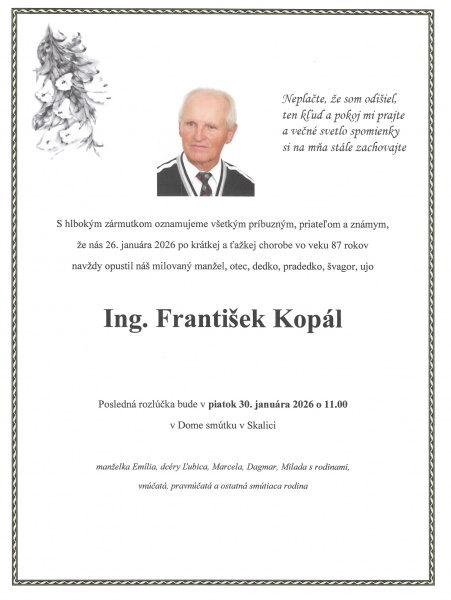 Dňa 26. januára 2026 navždy opustil slovenskú tenisovú komunitu vo veku 87 rokov Ing. František Kopál. V roku 1991 bol zakladajúcim členom tenisového klubu TC Partizánske a jeho predsedom až do roku 2000. O rozvoj tenisu v Partizánskom sa zaslúžil nielen ako funkcionár, ale aj ako tréner detí, organizátor turnajov a pôsobil tiež ako tenisový rozhodca. Za jeho aktívnu prácu v tenisovom hnutí mu Slovenský tenisový zväz udelil v roku 2009 Cenu za rozvoj tenisu. Posledná rozlúčka s Františkom Kopálom bude v piatok 30. januára 2026 o 11.00 h v Dome smútku v Skalici. Česť jeho pamiatke!